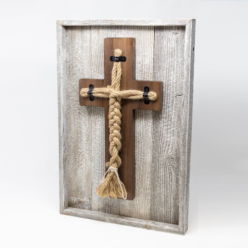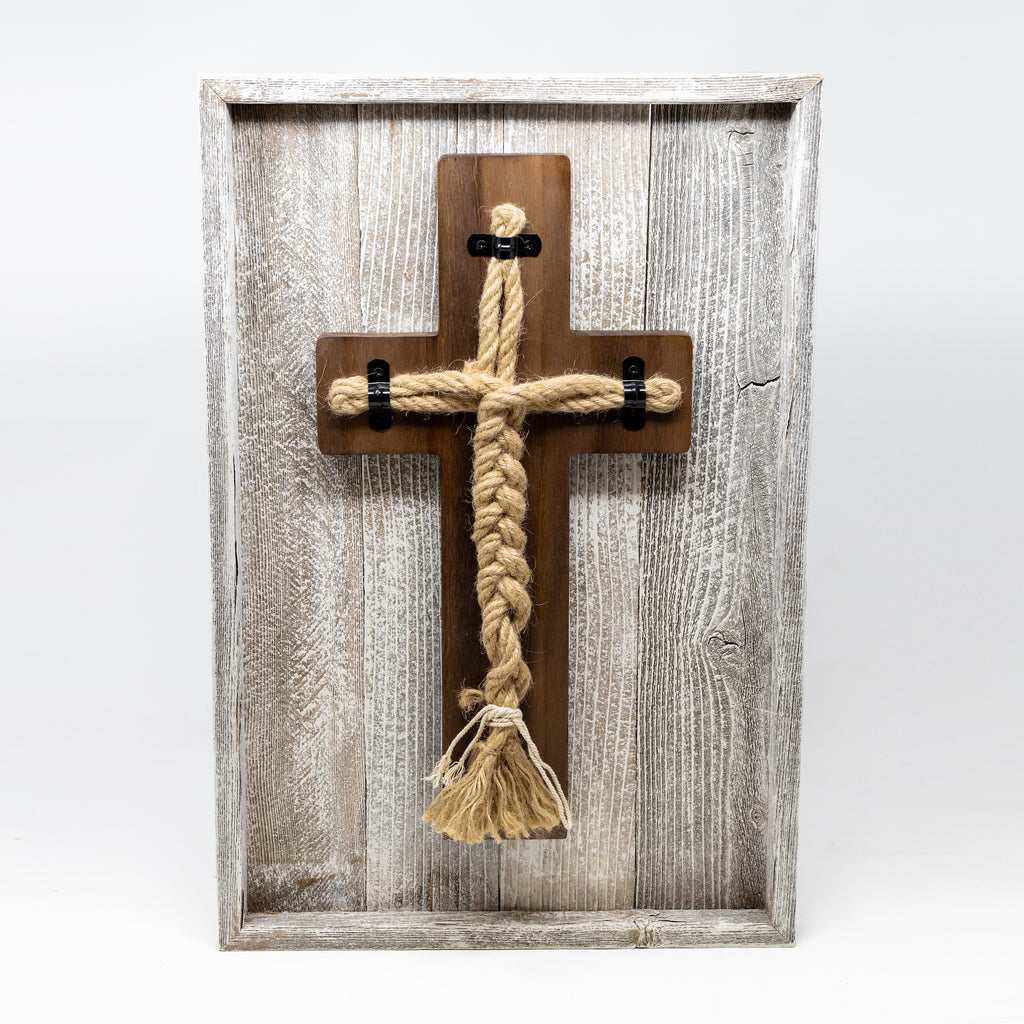 This stunning piece features a Reclaimed Barnwood Backboard with Weathered Pine Center Cross, Natural Rope, and Black Hardware.